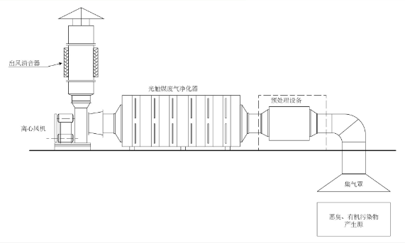 光觸媒廢氣處理設備裝置原理:采用高能C波段(僅次于切割不銹鋼的激光,強于氬弧焊光源的數十倍強度)在設備內,強裂解惡臭物質分子鏈,改變物質結構,將高分子污染物質,裂解、氧化成為低分子無害物質,如水和二氧化碳等。